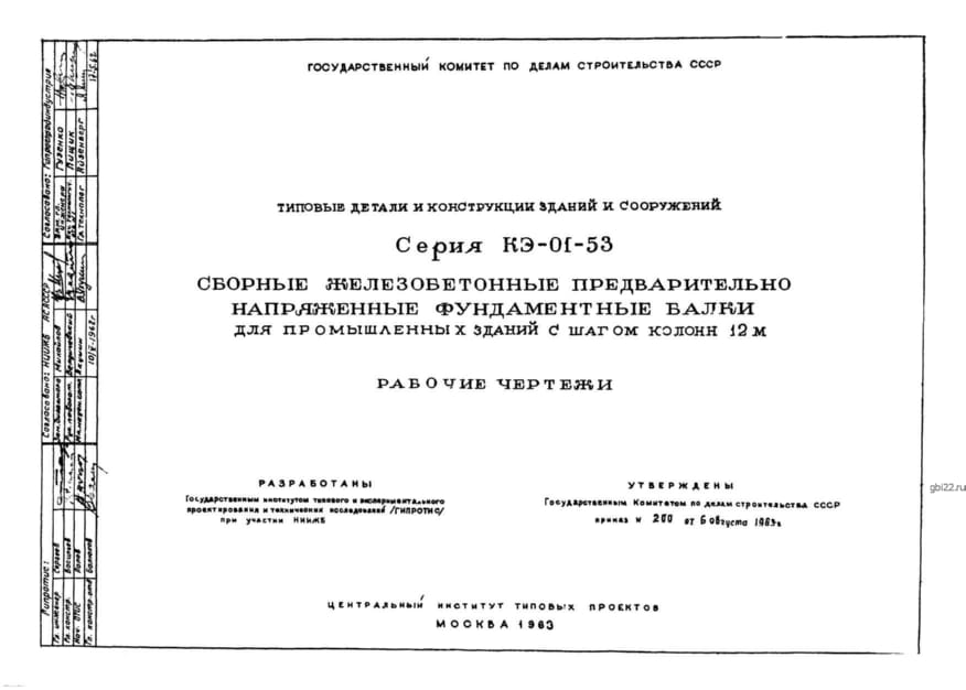 | Название стандарта | Сборные железобетонные предварительно напряженные фундаментные балки для промышленных зданий с шагом колонн 12 м. Рабочие чертежи. |