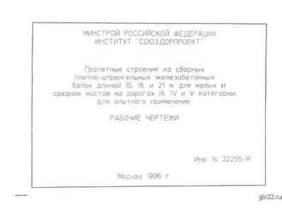| Название стандарта | Пролетные строения из сборных плитно-шпренгельных железобетонных балок длиной 15,18 и 21м для малых и средних мостов на дорогах III, IV и V категории. |