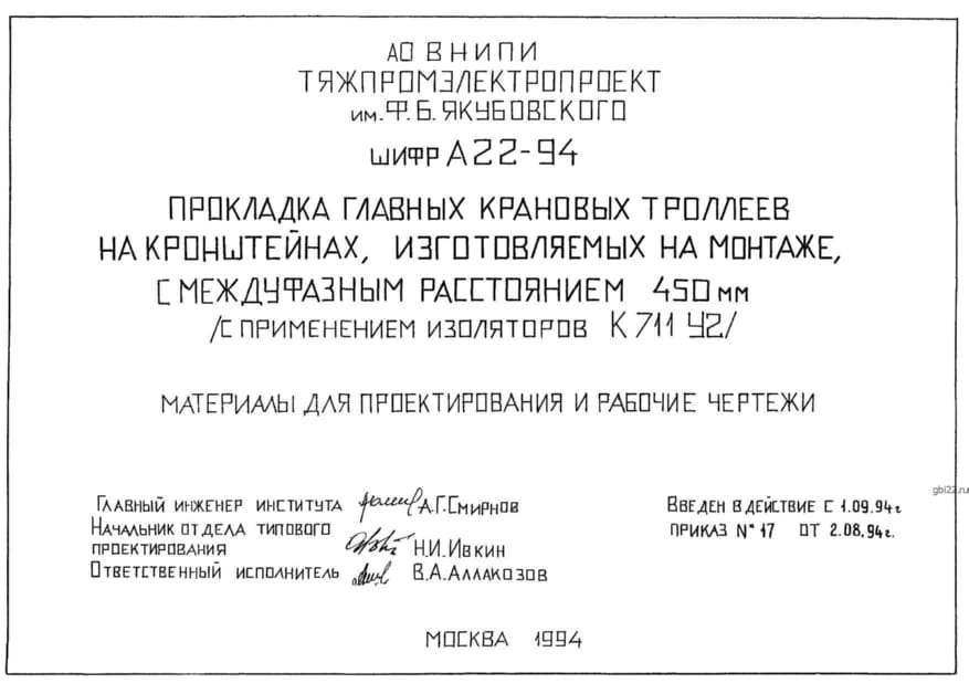 | Название стандарта | Прокладка главных крановых троллеев на кронштейнах, изготовляемых на монтаже, с междуфазным расстоянием 450 мм (с применением изоляторов К711 У2. Материалы для проектирования и рабочие чертежи. |