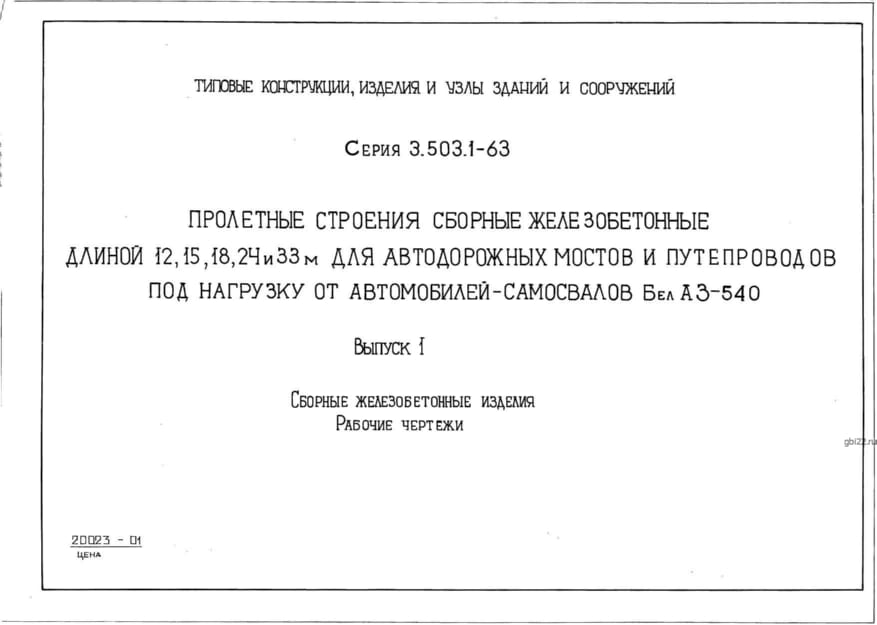 | Название стандарта | Пролетные строения сборные железобетонные длиной 12, 15, 18, 24 и 33 м для автодорожных мостов и путепроводов под нагрузку от автомобилей-самосвалов БелАЗ-540. |
