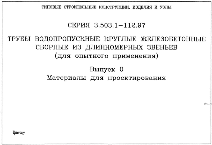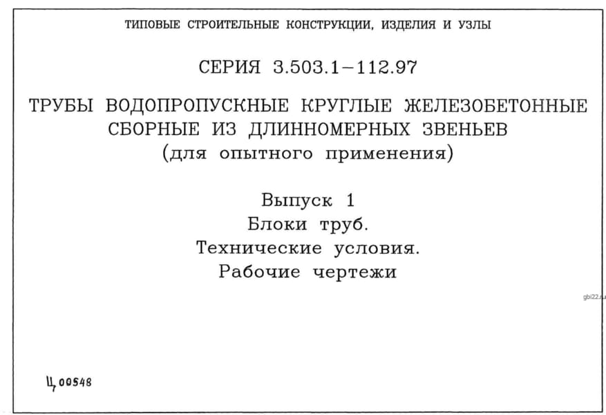 | Название стандарта | Трубы водопропускные круглые железобетонные из длинномерных звеньев (для опытного применения) - диаметром 1,5 м; 2х1,5 м; 3х1,5 м. |