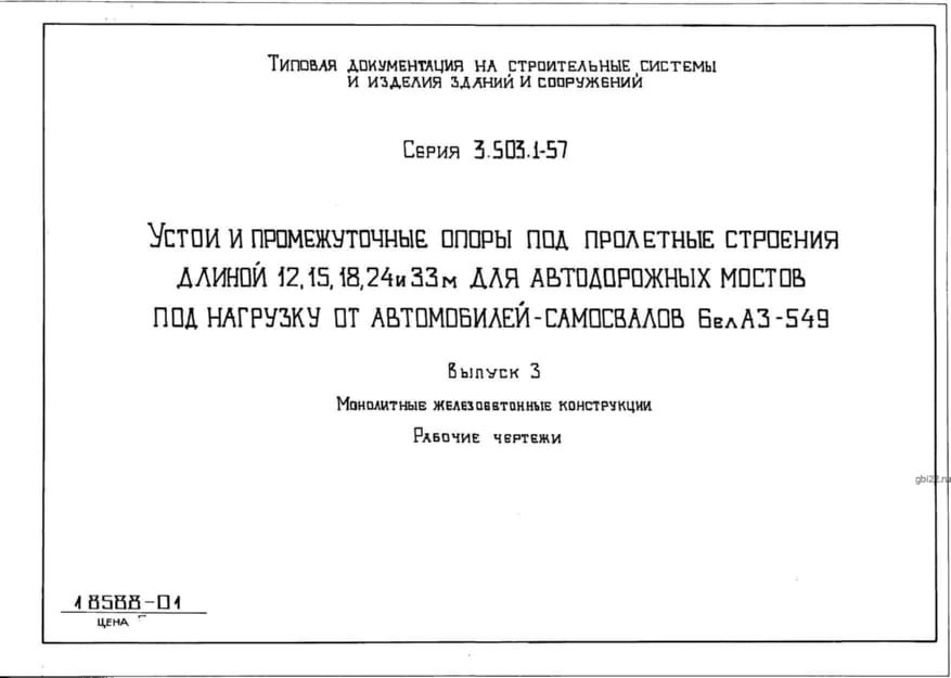 | Название стандарта | Устои и промежуточные опоры под пролетные строения длиной 12, 15, 18, 24 и 33 м для автодорожных мостов под нагрузку от автомобилей-самосвалов БелАЗ-549. |