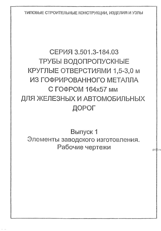 | Название стандарта | Трубы водопропускные круглые отверстиями 1,5-3,0 м из гофрированного металла с гофром 164 х 57 мм для железных и автомобильных дорог. |