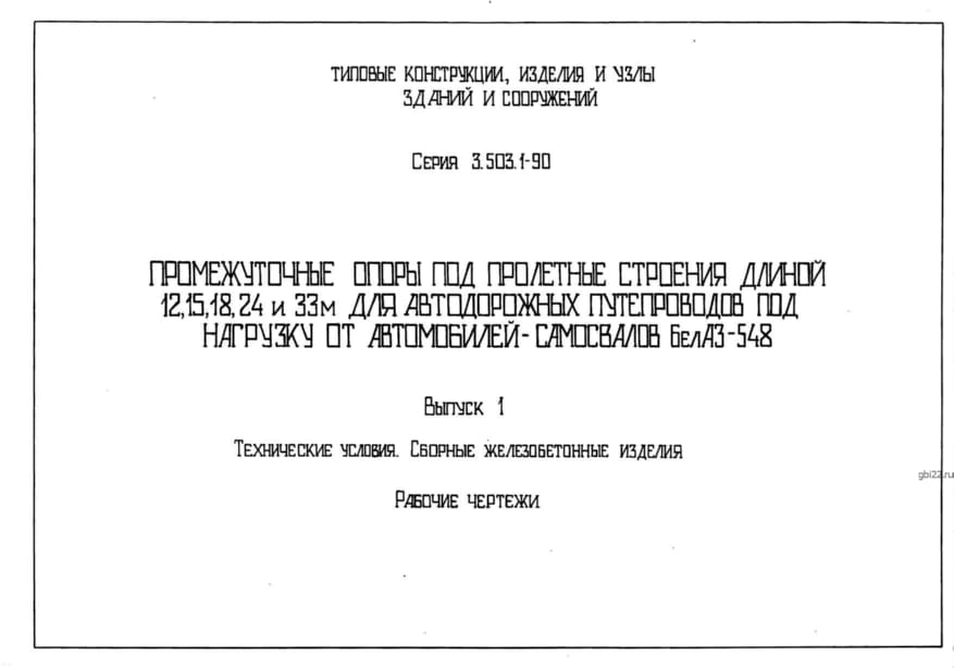 | Название стандарта | Промежуточные опоры под пролетные строения длиной 12, 15, 18, 24 и 33 м для автодорожных путепроводов под нагрузку от автомобилей-самосвалов БелАЗ-548. |