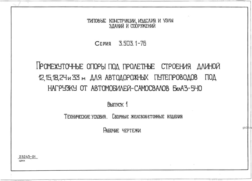 | Название стандарта | Промежуточные опоры под пролетные строения длиной 12, 15, 18, 24 и 33 м для автодорожных путепроводов под нагрузку от автомобилей-самосвалов БелАЗ-540. |