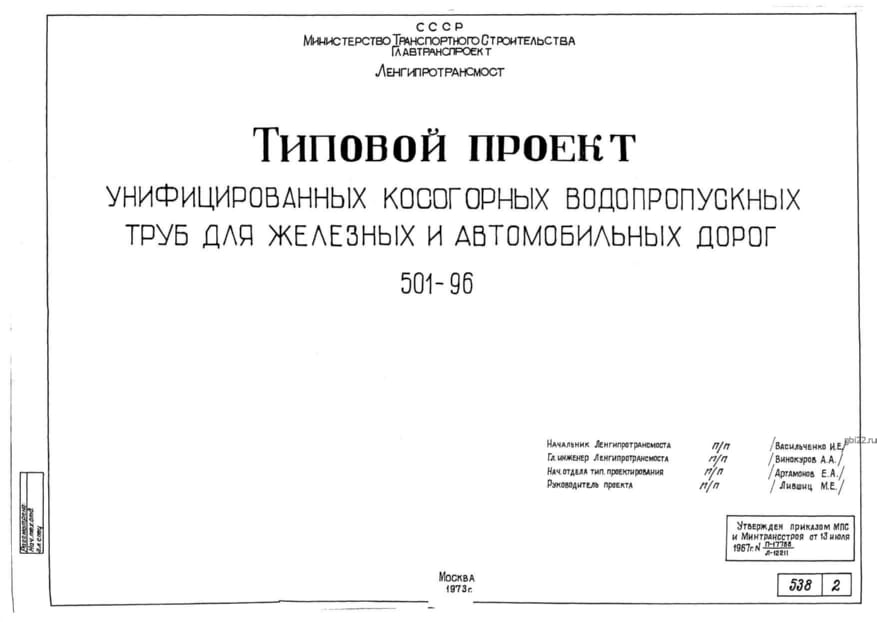 | Название стандарта | Типовой проект унифицированных косогорных водопропускных труб для железных и автомобильных дорог. |