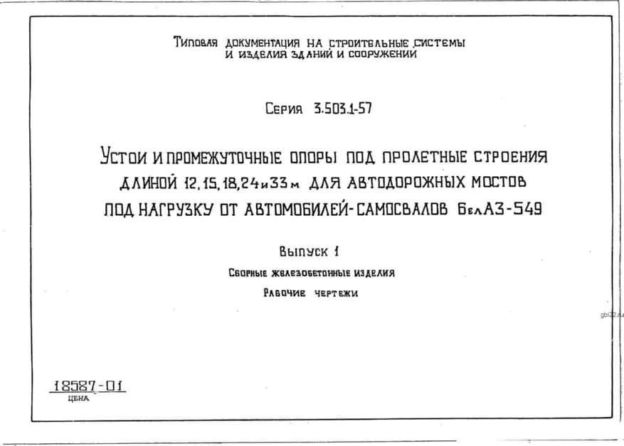 | Название стандарта | Устои и промежуточные опоры под пролетные строения длиной 12, 15, 18, 24 и 33 м для автодорожных мостов под нагрузку от автомобилей-самосвалов БелАЗ-549. |