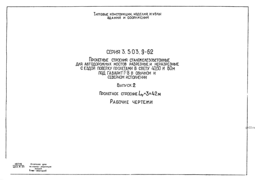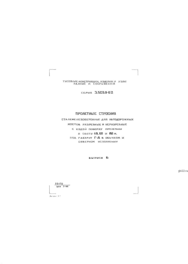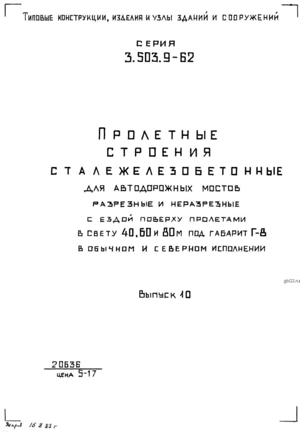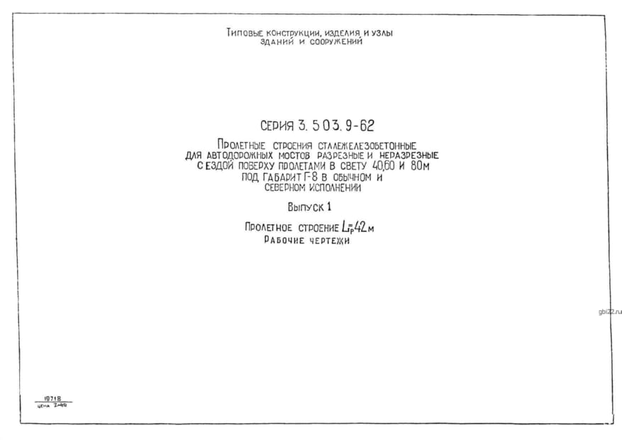 | Название стандарта | Пролетные строения сталежелезобетонные для автодорожных мостов разрезные и неразрезные с ездой поверху пролетами в свету 40, 60 и 80 м под габарит Г-8 в обычном и северном исполнении. |