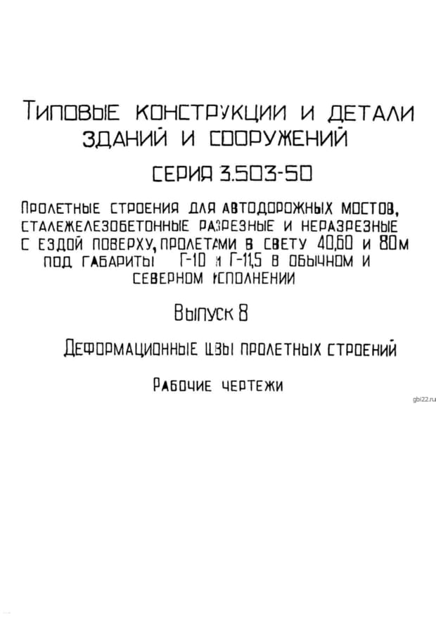 | Название стандарта | Пролетные строения для автодорожных мостов, сталежелезобетонные разрезные и неразрезные с ездой поверху, пролетами в свету 40, 60 и 80 м под габариты Г-10 и Г-11,5 в обычном и северном исполнении. |