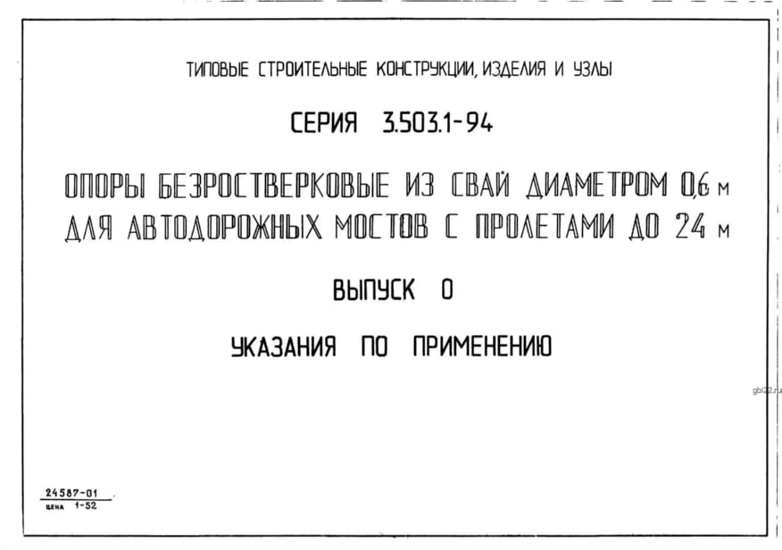 | Название стандарта | Опоры безростверковые из свай диаметром 0,6 м для автодорожных мостов с пролетами до 24 м. |
