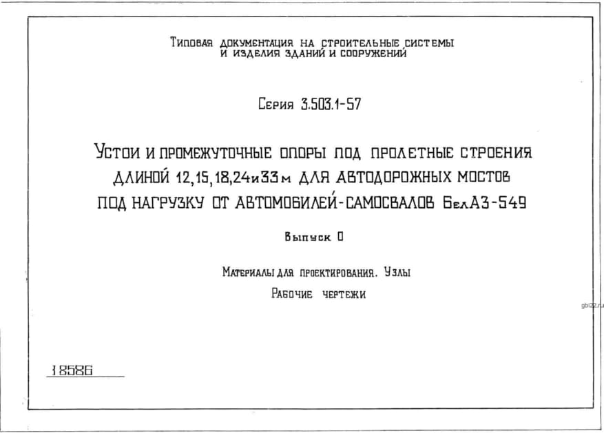 | Название стандарта | Устои и промежуточные опоры под пролетные строения длиной 12, 15, 18, 24 и 33 м для автодорожных мостов под нагрузку от автомобилей-самосвалов БелАЗ-549. |