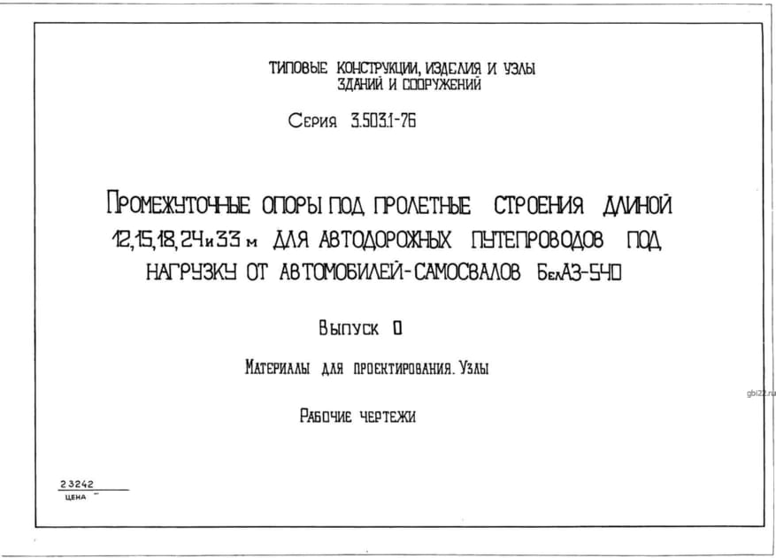 | Название стандарта | Промежуточные опоры под пролетные строения длиной 12, 15, 18, 24 и 33 м для автодорожных путепроводов под нагрузку от автомобилей-самосвалов БелАЗ-540. |