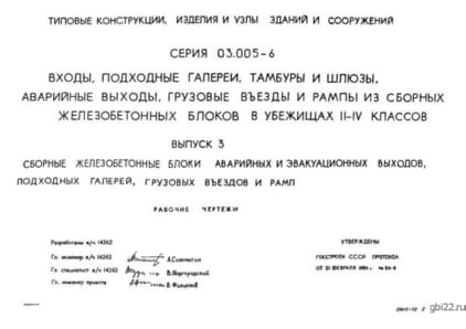 | Название стандарта | Входы, подходные галереи, тамбуры и шлюзы, аварийные выходы, грузовые въезды и рампы из сборных железобетонных блоков в убежищах II-IV классов. |
