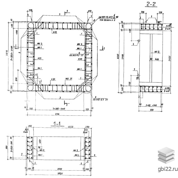 Армирование блоков выполняется с использованием пространственного каркаса, собранного из плоских каркасов. Рабочая и поперечная арматура изготовлены из горячекатаной стали класса A-III. В блоках предусмотрены закладные детали, упрощающие соединение изделий и крепление оборудования.