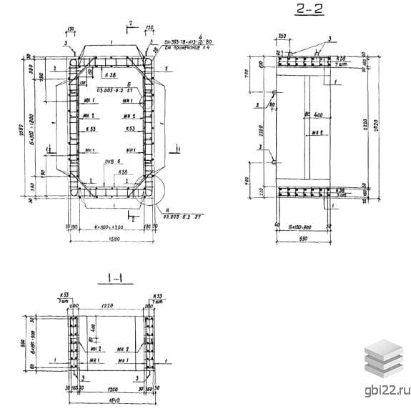 Армирование блоков выполняется пространственным каркасом, собранным из плоских каркасов. Рабочая и поперечная арматура изготовлены из горячекатаной стали класса А-III. В блоках предусмотрены закладные детали для упрощения соединения изделий и крепления оборудования. Для удобства погрузочно-разгрузочных работ блоки оснащаются монтажными петлями из арматурной стали класса А-I.
