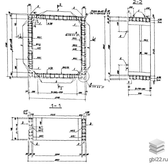 Армирование блоков осуществляется с помощью пространственного каркаса, собранного из плоских каркасов. Рабочая и поперечная арматура выполнены из горячекатаной стали класса A-III. В блоках предусмотрены закладные детали, упрощающие процессы соединения изделий и крепления оборудования.