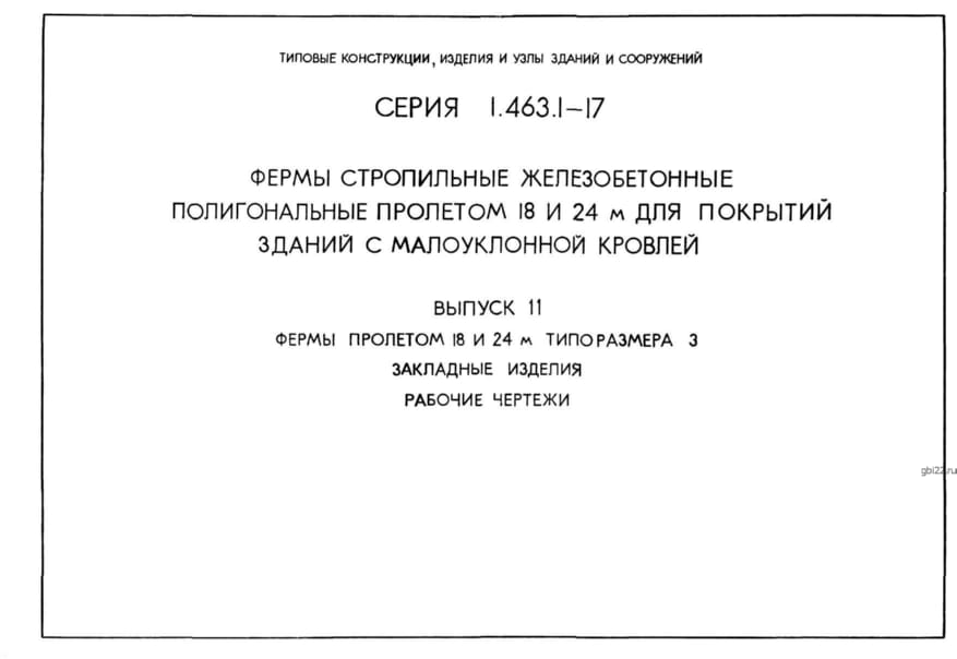 | Название стандарта | Фермы стропильные железобетонные полигональные пролетами 18 и 24 м для покрытий зданий с малоуклонной кровлей. |