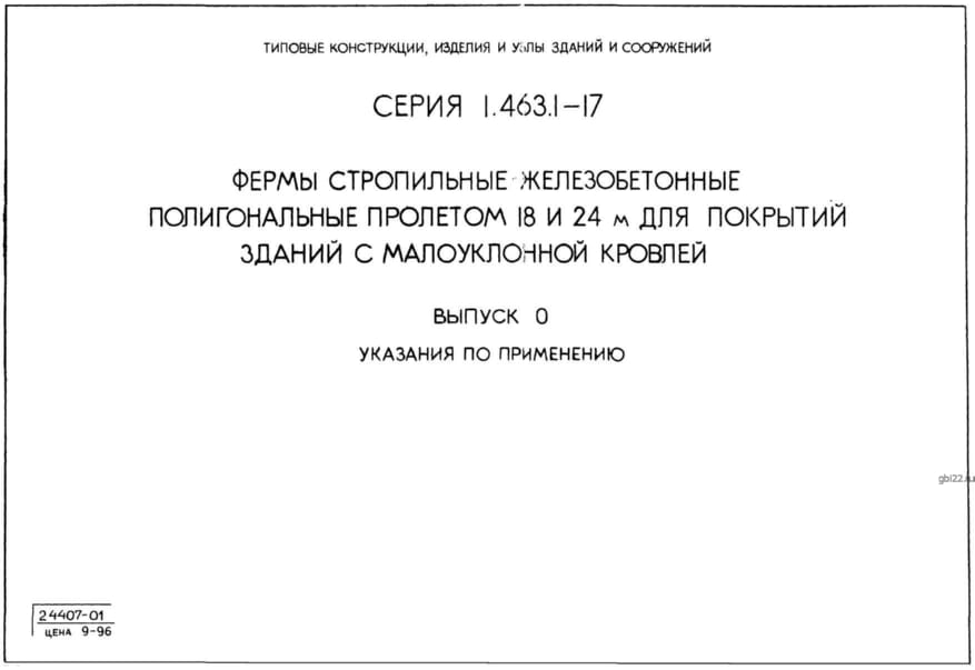 | Название стандарта | Фермы стропильные железобетонные полигональные пролетами 18 и 24 м для покрытий зданий с малоуклонной кровлей. |