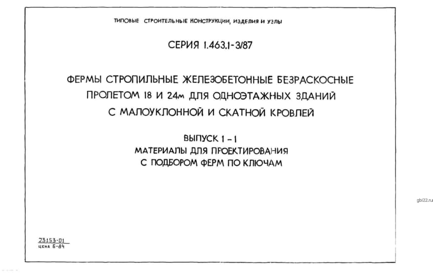 | Название стандарта | Фермы стропильные железобетонные безраскосные пролетом 18 и 24 м для одноэтажных зданий с малоуклонной и скатной кровлей. |