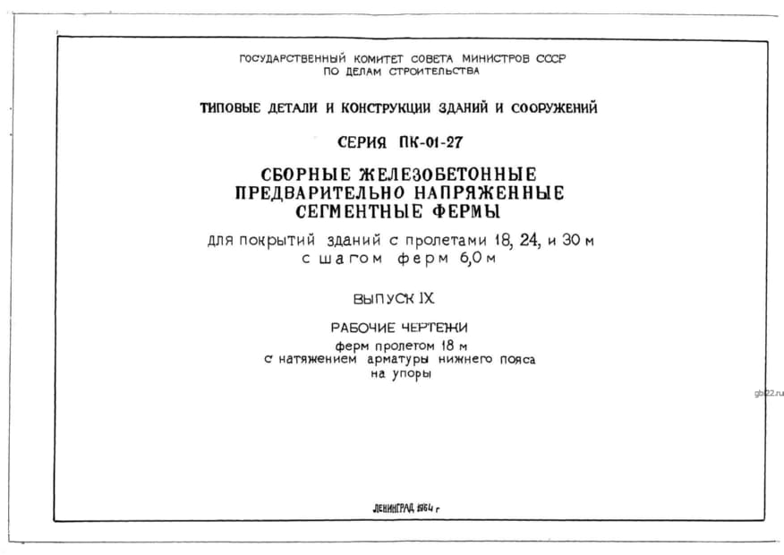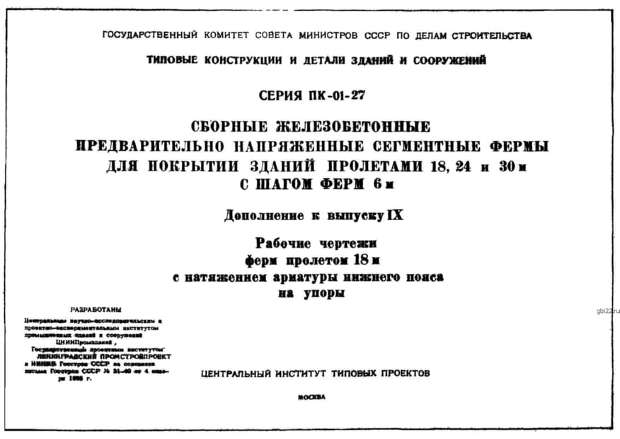 | Название стандарта | Сборные железобетонные предварительно напряженные сегментные фермы для покрытия зданий с пролетами 18, 24 и 30 м с шагом ферм 6,0 м. |