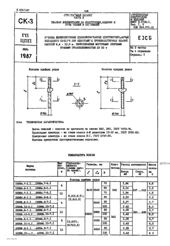 | Название стандарта | Колонны железобетонные цельноформованные, центрифугированные кольцевого сечения для одноэтажных производственных зданий высотой 8,4 - 12 м, оборудованных мостовыми опорными кранами грузоподъемностью до 32 т. |