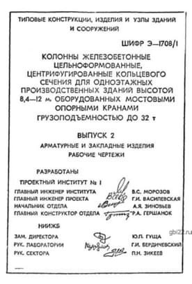 | Название стандарта | Колонны железобетонные цельноформованные, центрифугированные кольцевого сечения для одноэтажных производственных зданий высотой 8,4 - 12 м, оборудованных мостовыми опорными кранами грузоподъемностью до 32 т. |