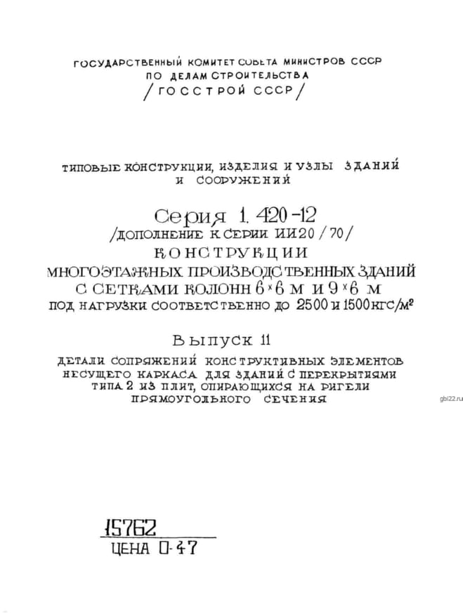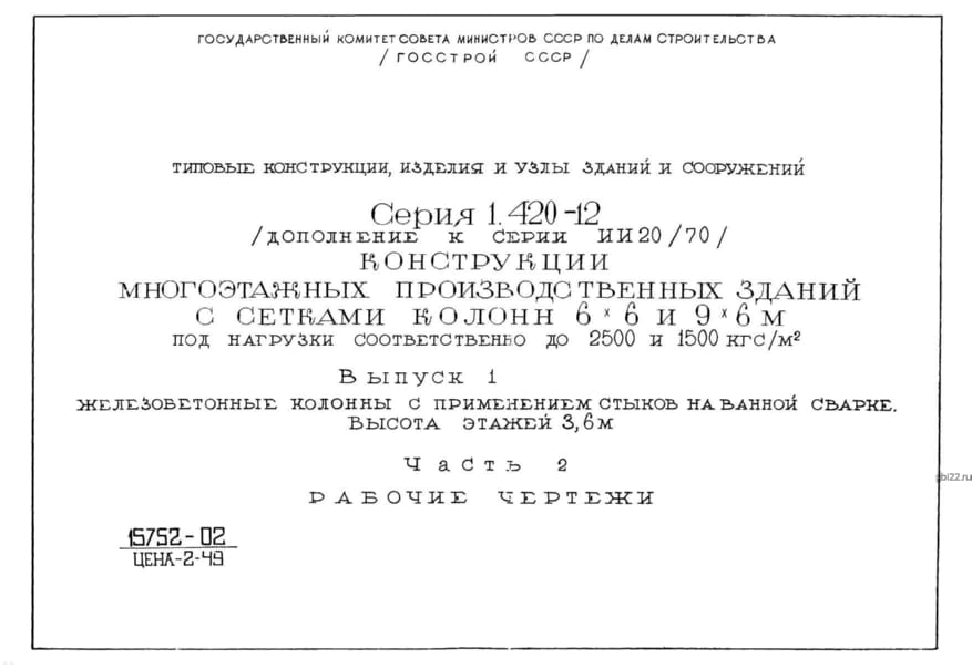 | Название стандарта | Конструкции многоэтажных производственных зданий с сетками колонн 6х6 и 9х6 м под нагрузки соответственно до 2500 и 1500 кгс/кв. м. |