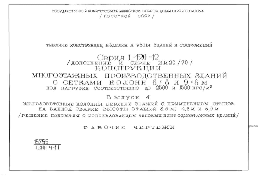 | Название стандарта | Конструкции многоэтажных производственных зданий с сетками колонн 6х6 и 9х6 м под нагрузки соответственно до 2500 и 1500 кгс/кв. м. |