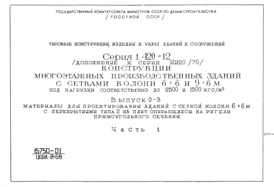 | Название стандарта | Конструкции многоэтажных производственных зданий с сетками колонн 6х6 и 9х6 м под нагрузки соответственно до 2500 и 1500 кгс/кв. м. |