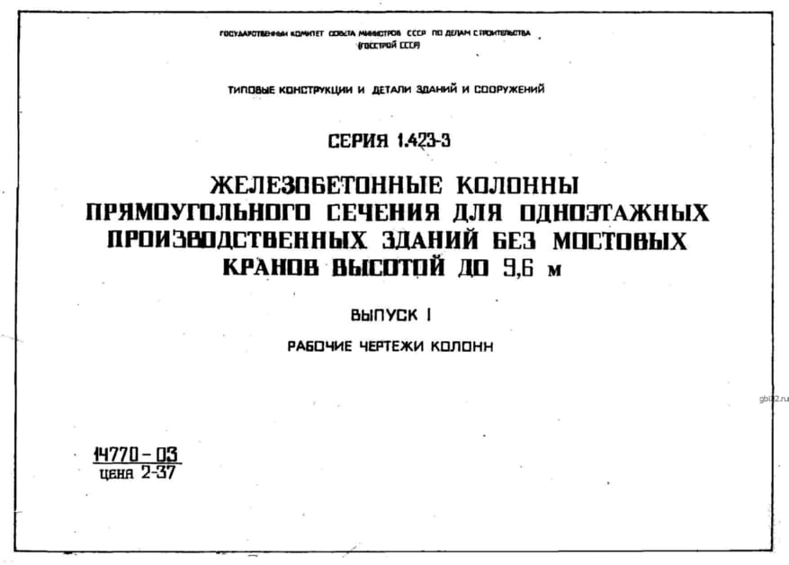 | Название стандарта | Железобетонные колонны прямоугольного сечения для одноэтажных производственных зданий без мостовых кранов высотой до 9,6 м. |