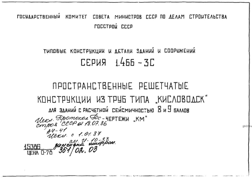 | Название стандарта | Пространственные решетчатые конструкции из труб типа "Кисловодск" для зданий с расчетной сейсмичностью 8 и 9 баллов. Чертежи КМ. |