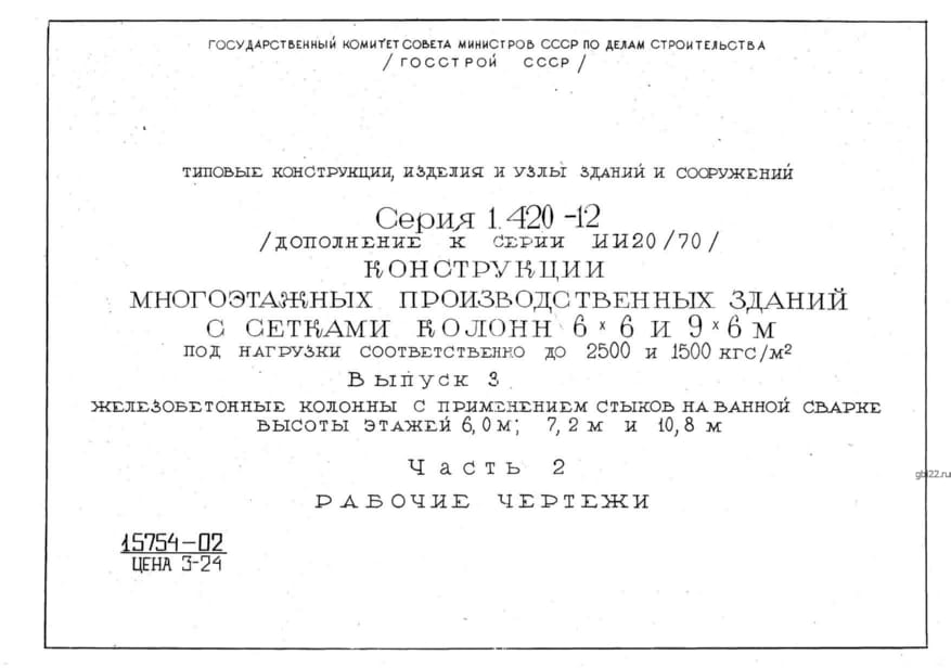 | Название стандарта | Конструкции многоэтажных производственных зданий с сетками колонн 6х6 и 9х6 м под нагрузки соответственно до 2500 и 1500 кгс/кв. м. |