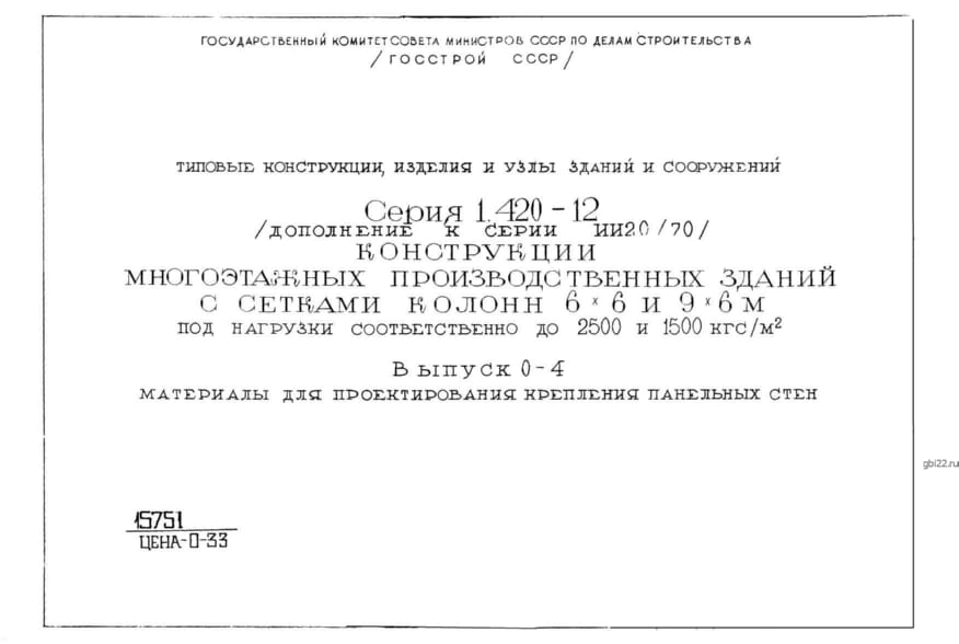 | Название стандарта | Конструкции многоэтажных производственных зданий с сетками колонн 6х6 и 9х6 м под нагрузки соответственно до 2500 и 1500 кгс/кв. м. |