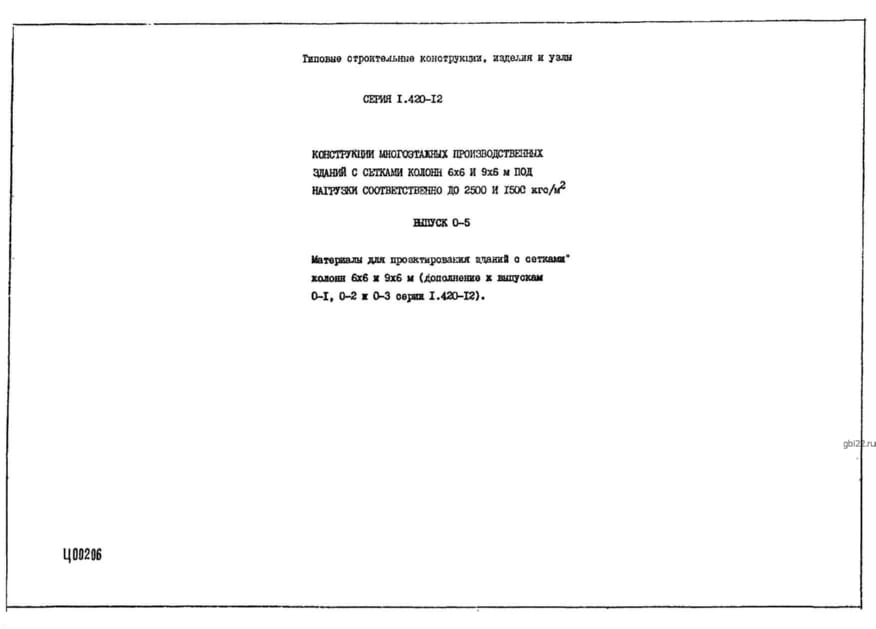 | Название стандарта | Конструкции многоэтажных производственных зданий с сетками колонн 6х6 и 9х6 м под нагрузки соответственно до 2500 и 1500 кгс/кв. м. |