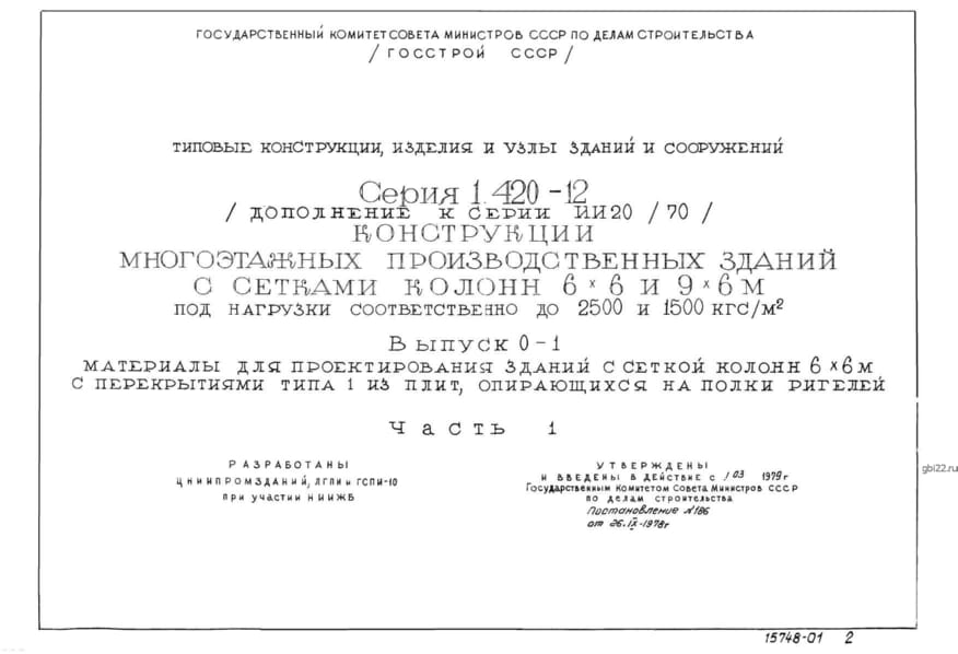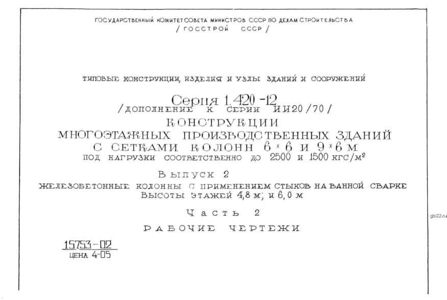 | Название стандарта | Конструкции многоэтажных производственных зданий с сетками колонн 6х6 и 9х6 м под нагрузки соответственно до 2500 и 1500 кгс/кв. м. |