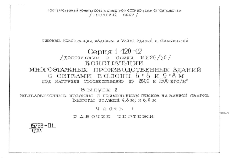 | Название стандарта | Конструкции многоэтажных производственных зданий с сетками колонн 6х6 и 9х6 м под нагрузки соответственно до 2500 и 1500 кгс/кв. м. |
