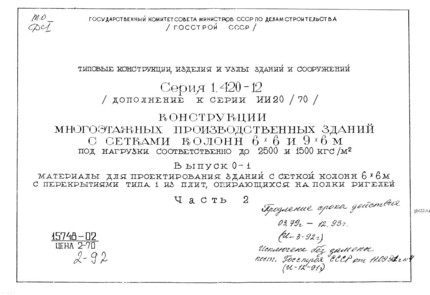 | Название стандарта | Конструкции многоэтажных производственных зданий с сетками колонн 6х6 и 9х6 м под нагрузки соответственно до 2500 и 1500 кгс/кв. м. |