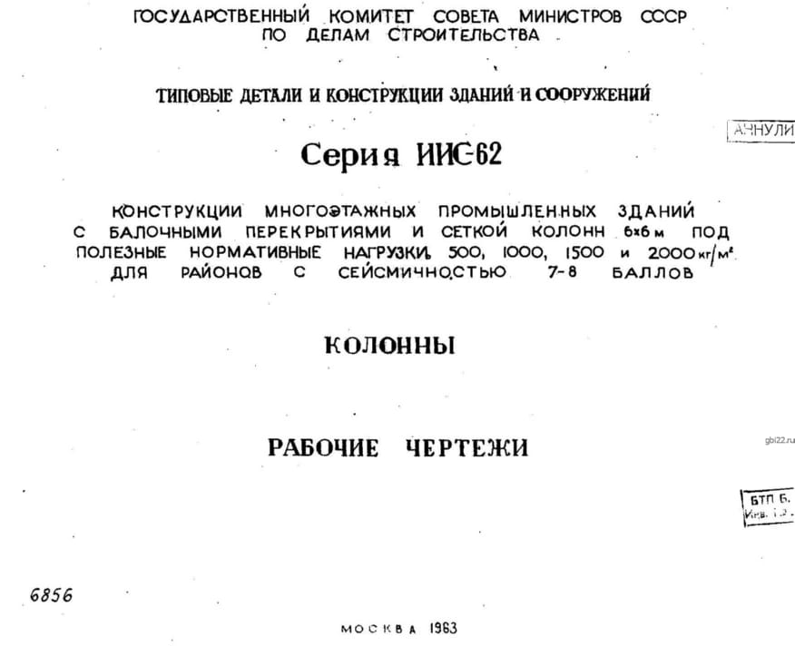| Название стандарта | Конструкции многоэтажных промышленных зданий с балочными перекрытиями и сеткой колонн 6?6 м под полезные нормативные нагрузки 500, 1000, 1500 и 2000 кг/м2 для районов с сейсмичностью 7-8 баллов. Колонны. |