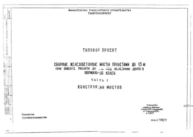 | Название стандарта | Сборные железобетонные мосты пролетами до 15 м при высоте насыпи до 8 м под железную дорогу нормальной колеи. |
