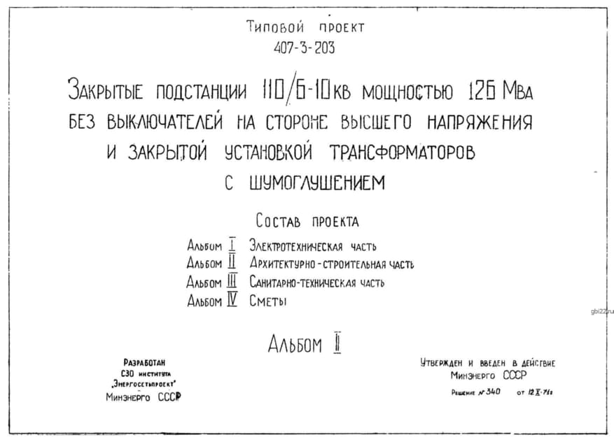 | Название стандарта | Закрытые подстанции 110/6 - 10 кВ мощностью 126 МВА без выключателей на стороне высшего напряжения и закрытой установкой трансформаторов с шумоглушением. |
