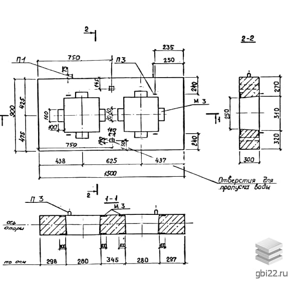Опоры представляют собой сборные железобетонные плиты прямоугольной формы с 1-2 сквозными отверстиями (прямоугольными или восьмигранными). В комплектацию входят металлические патрубки для крепления труб.
