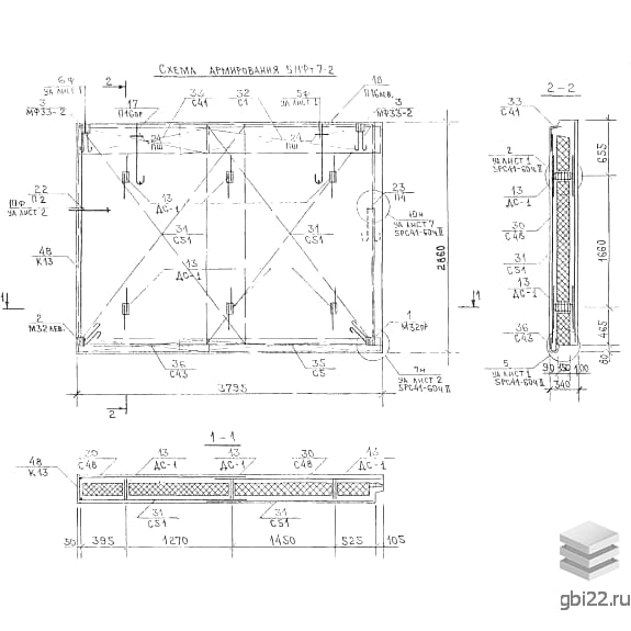 Армирование выполняется стальными каркасами (ГОСТ 5781-82) и сетками из стали классов AII, AIII и проволоки Вр-1 (ГОСТ 6727-80). Утеплитель – пенопласт ПСБ-25 или минеральная вата.