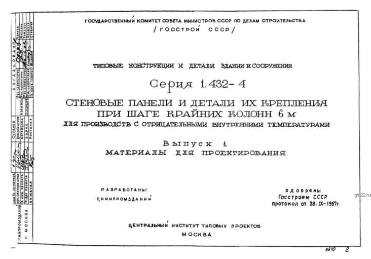 | Название стандарта | Стеновые панели и детали их крепления при шаге крайних колонн 6 м для производств с отрицательными внутренними температурами. |