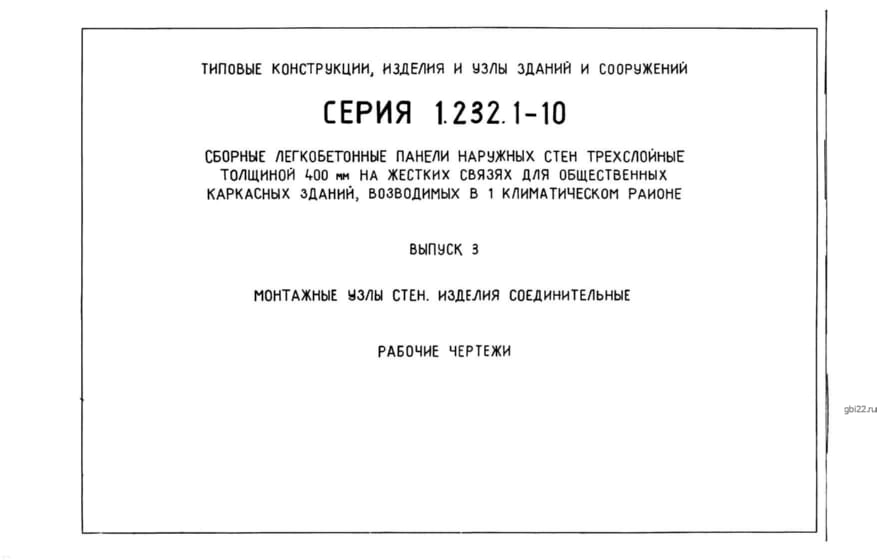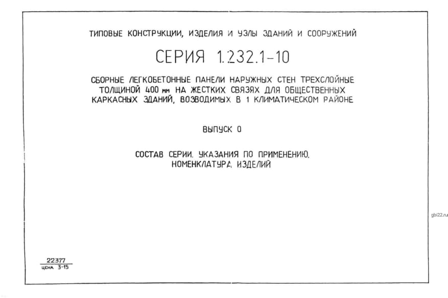 | Название стандарта | Сборные легкобетонные панели наружных стен трехслойные толщиной 400 мм на жестких связях для общественных каркасных зданий, возводимых в I климатическом районе. |