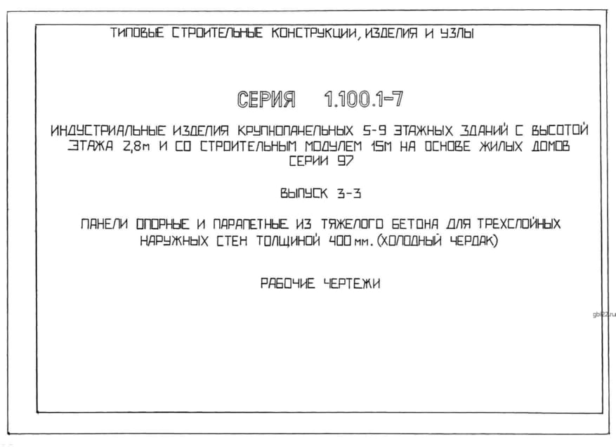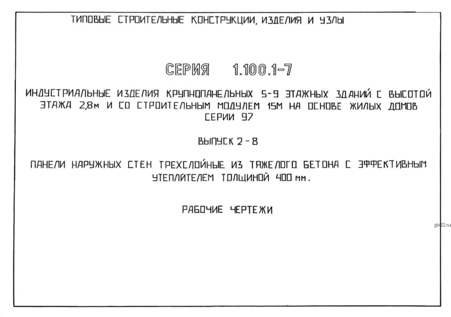 | Название стандарта | Индустриальные изделия крупнопанельных 5 – 9 этажных зданий с высотой этажа 2,8 м и со строительным модулем 15 м на основе жилых домов серии 97. Выпуск 0. Состав серии. Материалы для проектирования. |