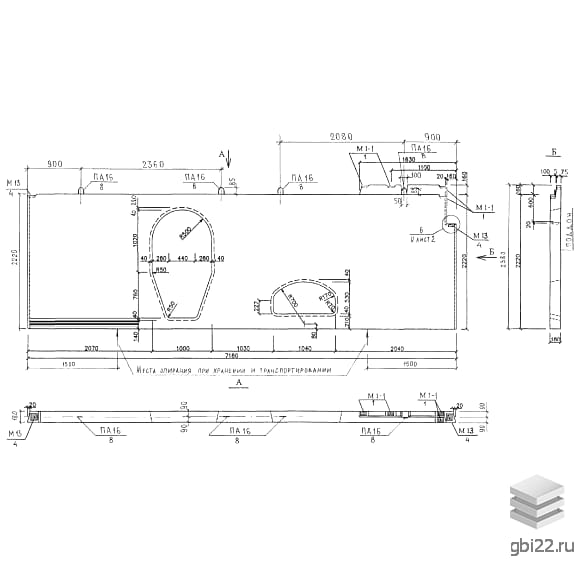 Перевозка осуществляется на панелевозах с фиксацией конструкций. Складирование — вертикально на подкладках в указанных местах. Погрузка — за монтажные петли с балансирующими траверсами.