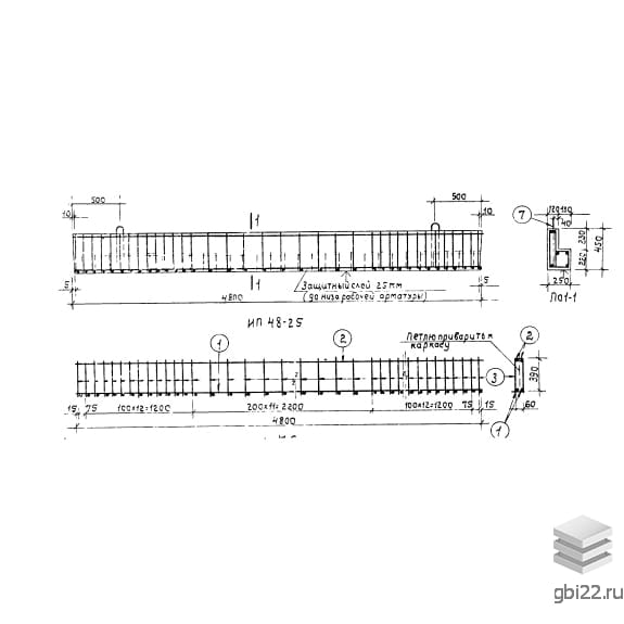 Перемычки ИП 48-25 – это железобетонные конструкции высокой прочности, обладающие продолговатой прямоугольной формой и сечением. Благодаря надежному армированию, они обеспечивают высокую несущую способность (до 1500 кг/м с учетом собственного веса).