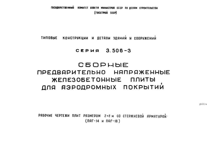 | Название стандарта | Сборные предварительно напряженные железобетонные плиты для аэродромных покрытий. Рабочие чертежи плит размером 2х6 м со стержневой арматурой (ПАГ-14 и ПАГ-18). |