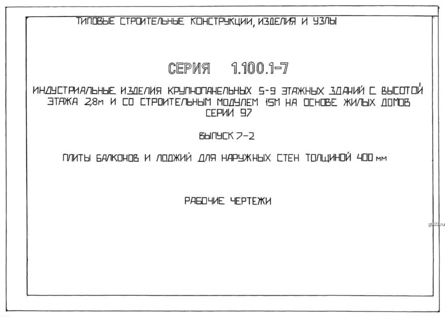 | Название стандарта | Индустриальные изделия крупнопанельных 5 – 9 этажных зданий с высотой этажа 2,8 м и со строительным модулем 15 м на основе жилых домов серии 97. Выпуск 0. Состав серии. Материалы для проектирования. |
