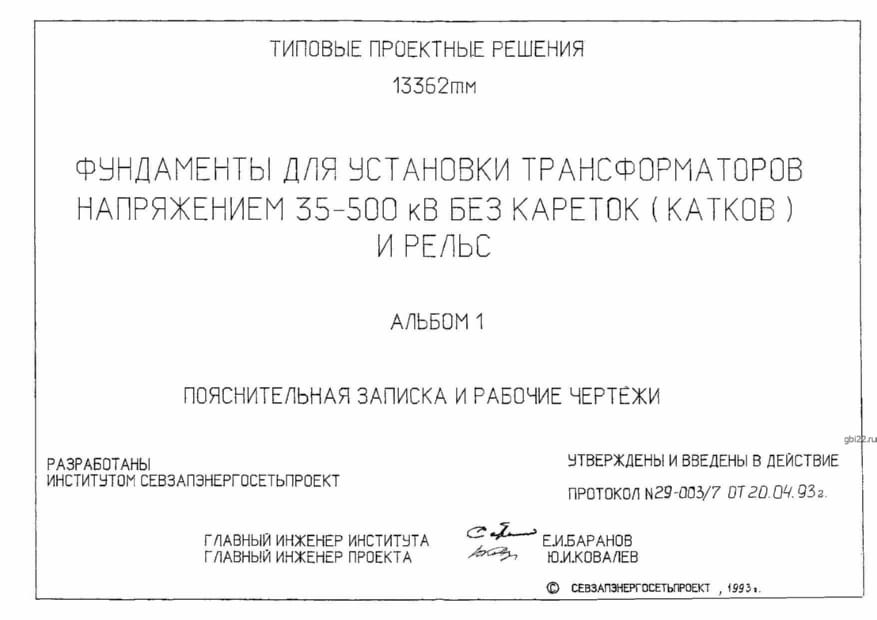 | Название стандарта | Фундаменты для установки трансформаторов напряжением 35-500 кВ без кареток (катков) и рельс. |